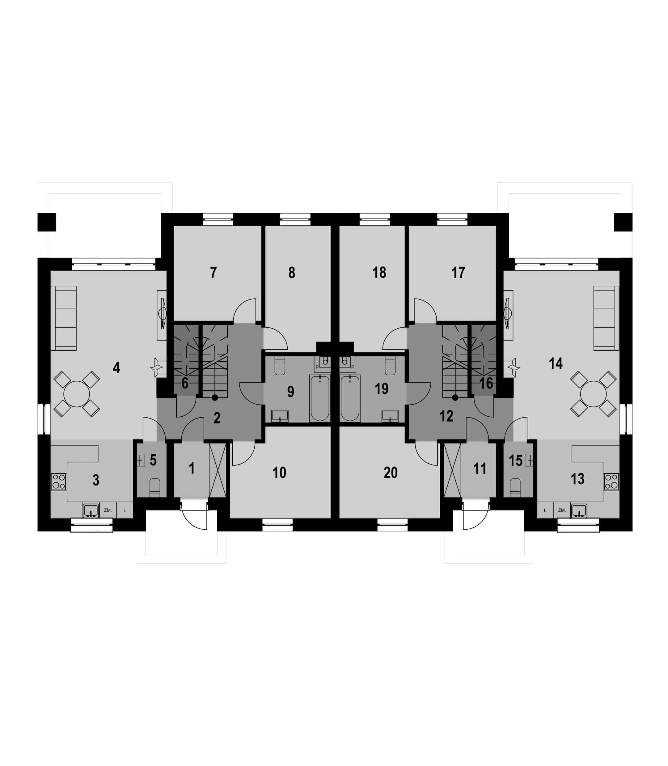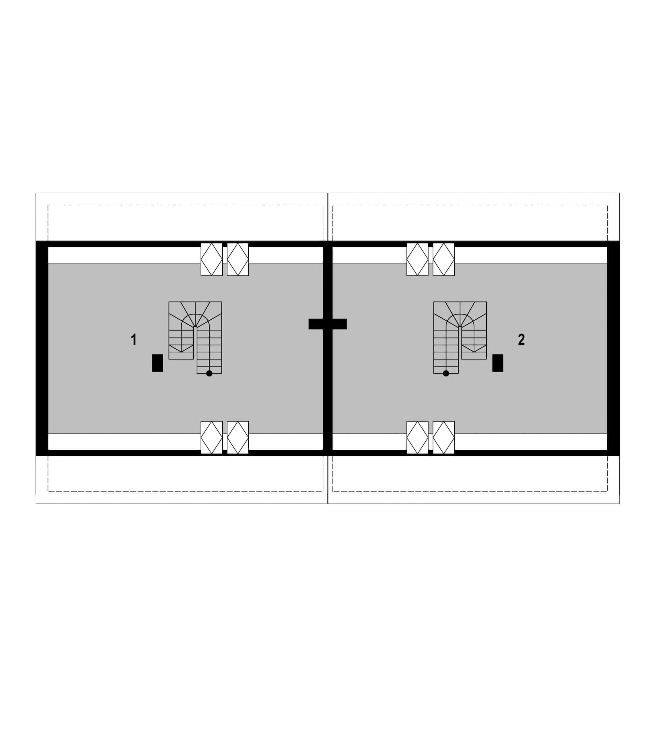 Eco 42 to dom parterowy w zabudowie bliźniaczej, doskonała propozycja dla inwestorów prywatnych jak i deweloperów.  Prosta i zwarta bryła zwieńczona dwuspadowym dachem zapewni inwestycji ekonomiczny charakter i krótki czas budowy. Taka konstrukcja pozwoli nie tylko zaoszczędzić na kosztach budowy i późniejszej eksploatacji, ale również doskonale wpisze się w każdy krajobraz. Ciemna dachówka doskonale komponuje się z jasnym tynkiem i drewnianą okładziną.