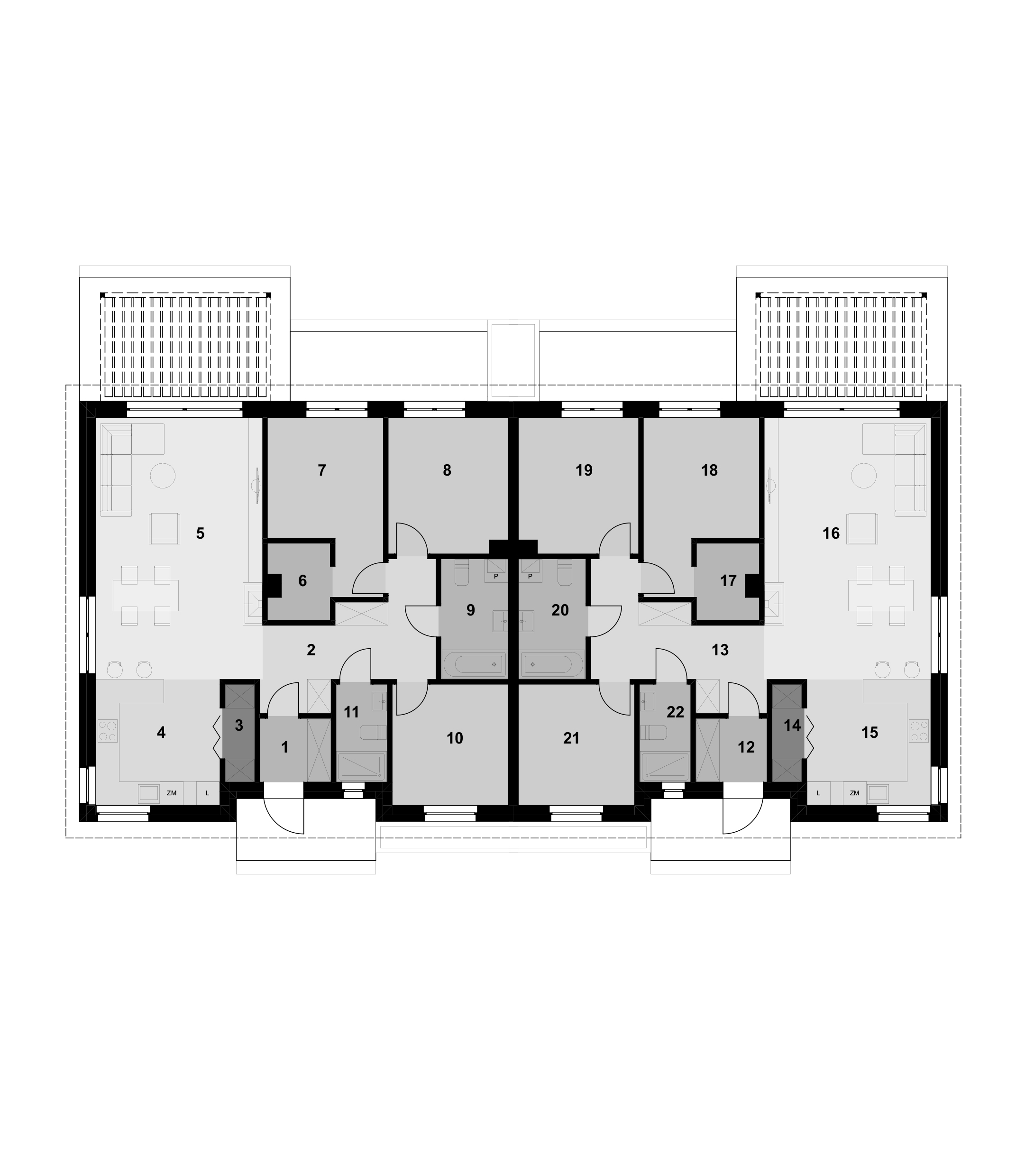 Eco 52 to propozycja idealna zarówno dla deweloperów, jak i inwestorów prywatnych, przede wszystkim ze względu na niskie koszty realizacji. Estetykę budynku podkreśla połączenie szarej dachówki z jasnym tynkiem i drewnianą okładziną. Projekt jest dostępny również w wersji jednorodzinnej dwulokalowej.