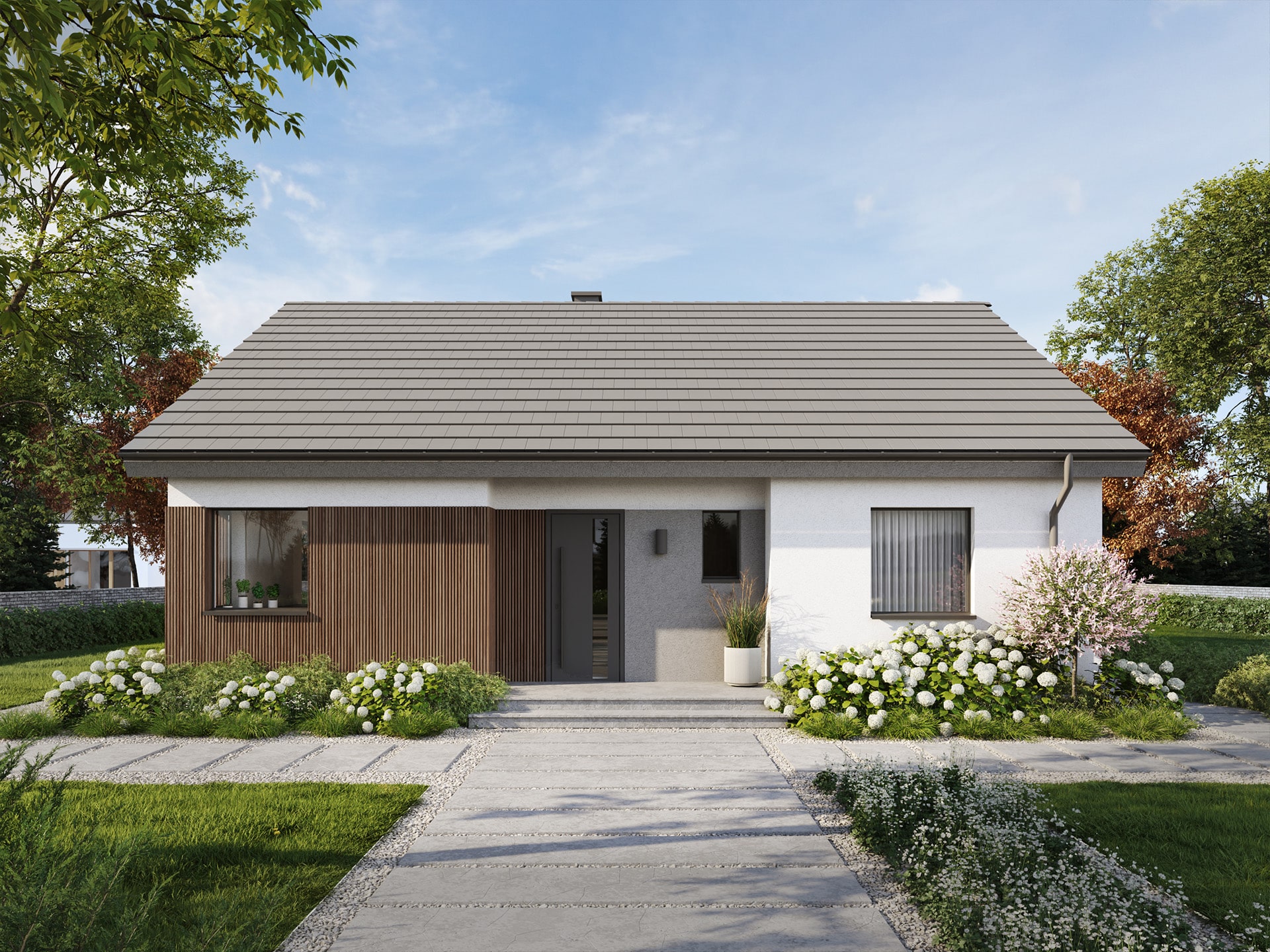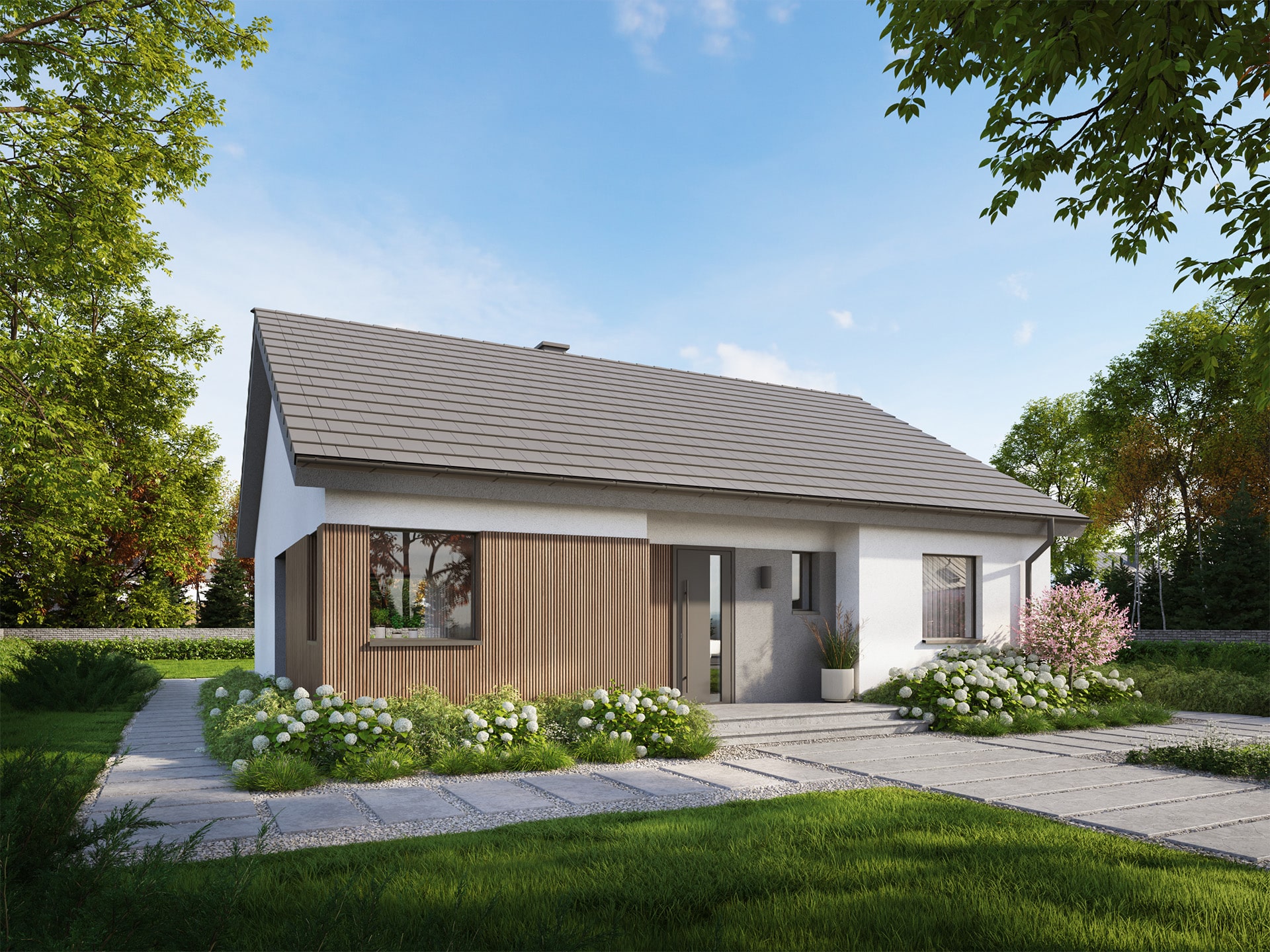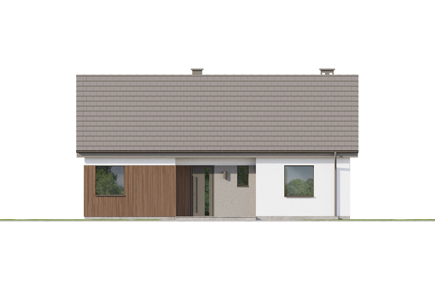 Eco 53 to dom parterowy, doskonała propozycja dla inwestorów prywatnych jak i deweloperów.  Prosta i zwarta bryła zwieńczona dwuspadowym dachem zapewni inwestycji ekonomiczny charakter i krótki czas budowy. Taka konstrukcja pozwoli nie tylko zaoszczędzić na kosztach budowy i późniejszej eksploatacji, ale również doskonale wpisze się w każdy krajobraz. Ciemna dachówka doskonale komponuje się z jasnym tynkiem i drewnianą okładziną.