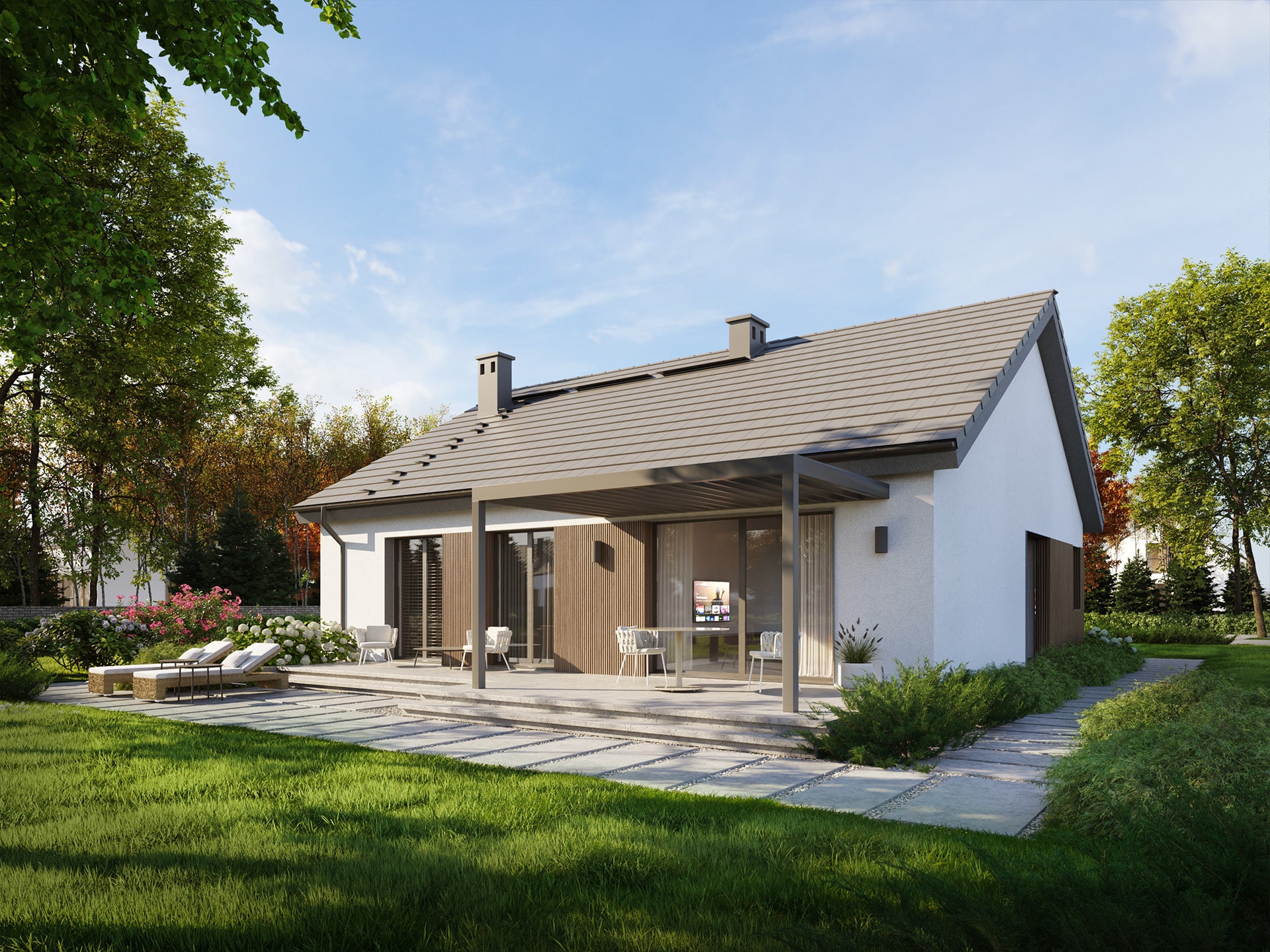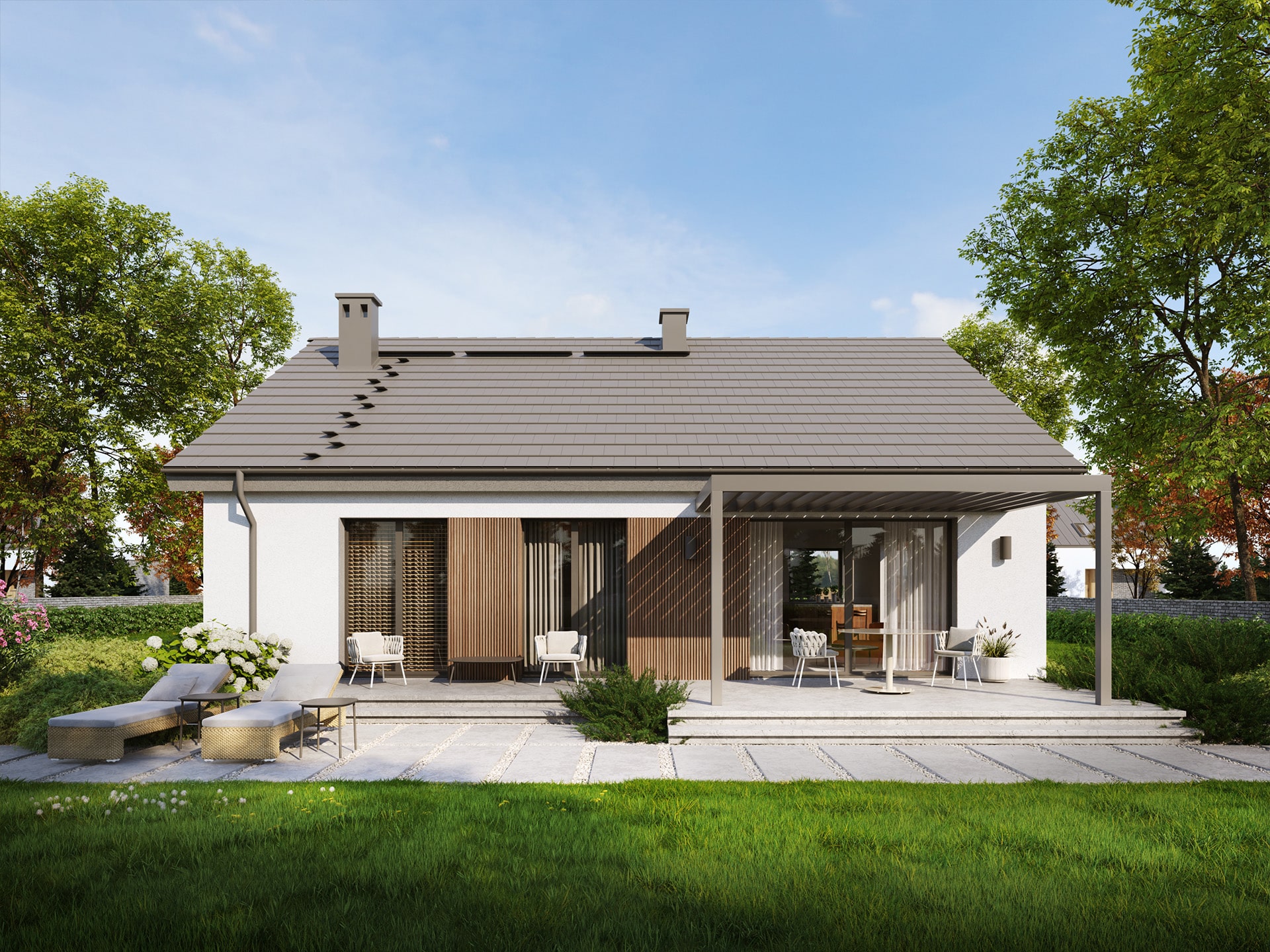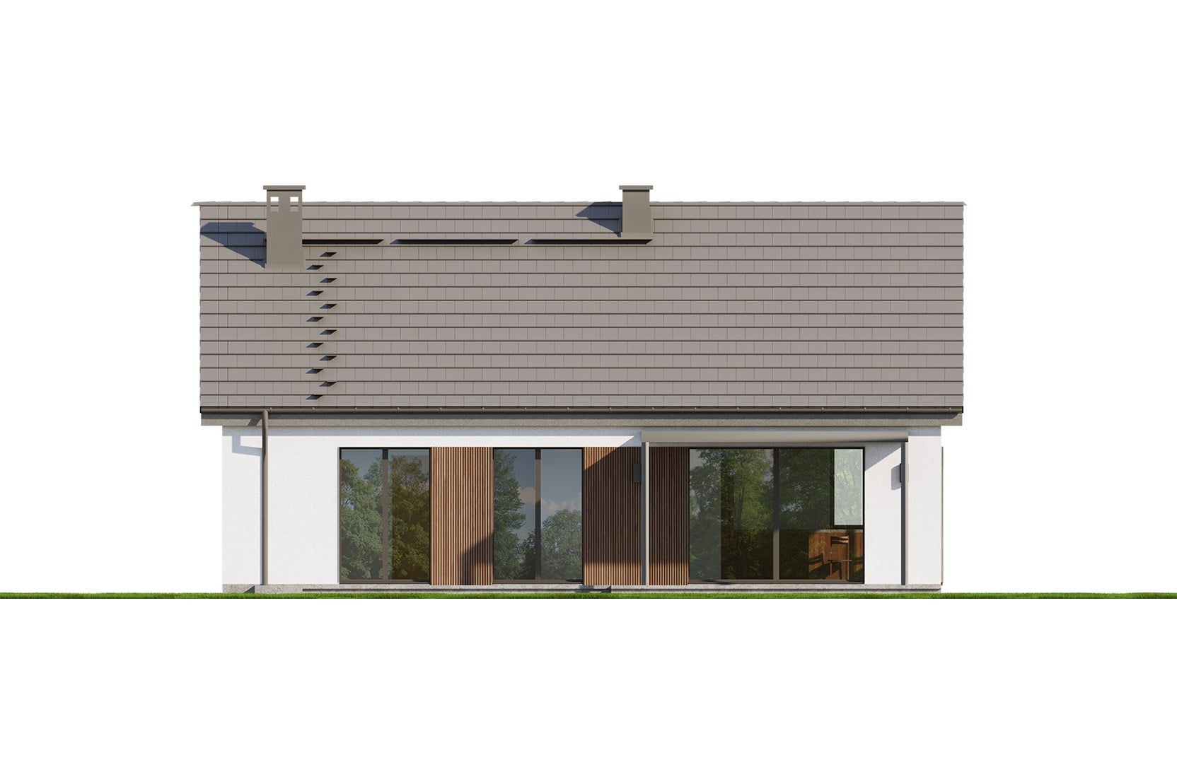 Eco 53 to dom parterowy, doskonała propozycja dla inwestorów prywatnych jak i deweloperów.  Prosta i zwarta bryła zwieńczona dwuspadowym dachem zapewni inwestycji ekonomiczny charakter i krótki czas budowy. Taka konstrukcja pozwoli nie tylko zaoszczędzić na kosztach budowy i późniejszej eksploatacji, ale również doskonale wpisze się w każdy krajobraz. Ciemna dachówka doskonale komponuje się z jasnym tynkiem i drewnianą okładziną.