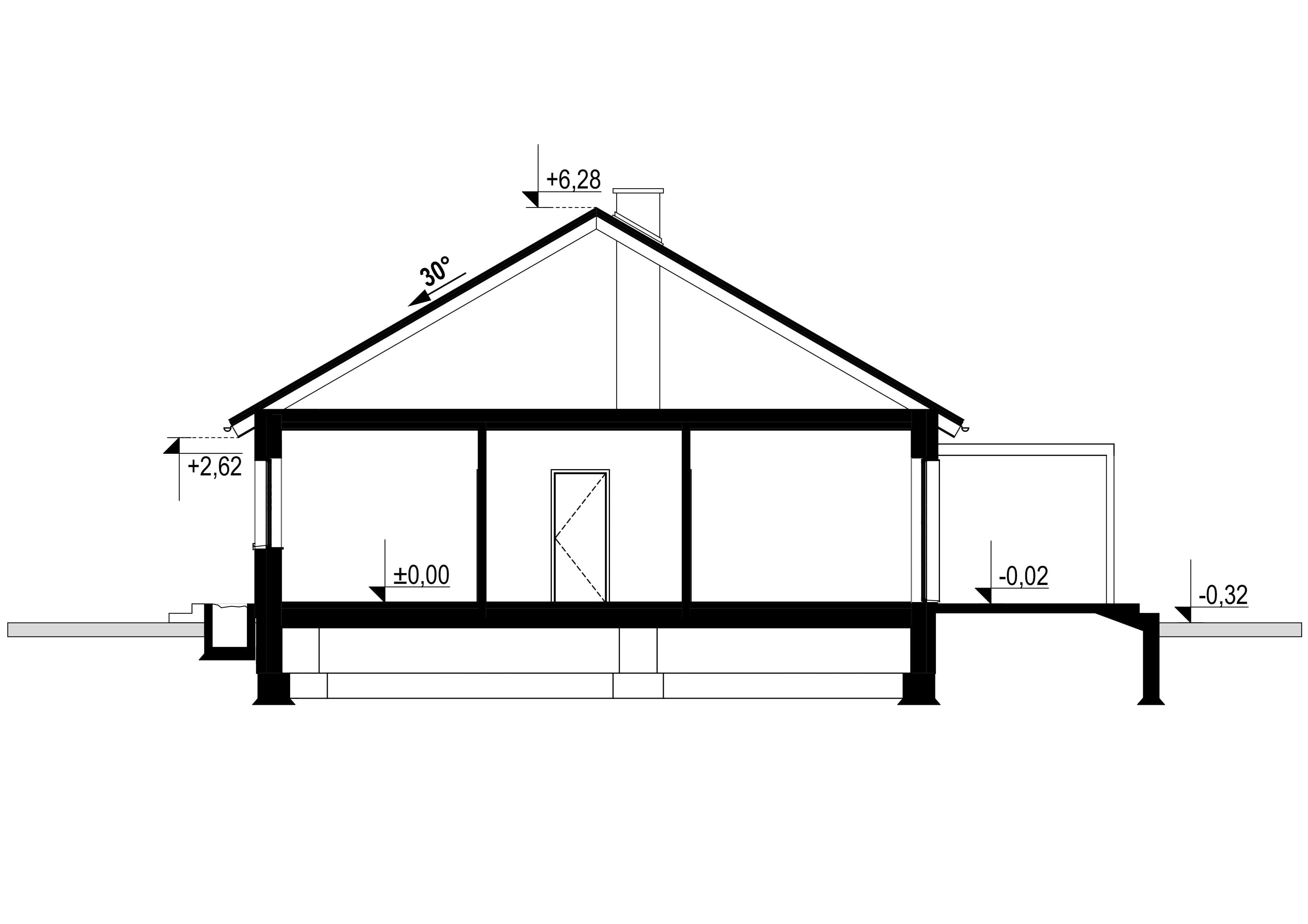 • dach: dwuspadowy nachylenie 30', wiązar prefabrykowany, dachówka ceramiczna