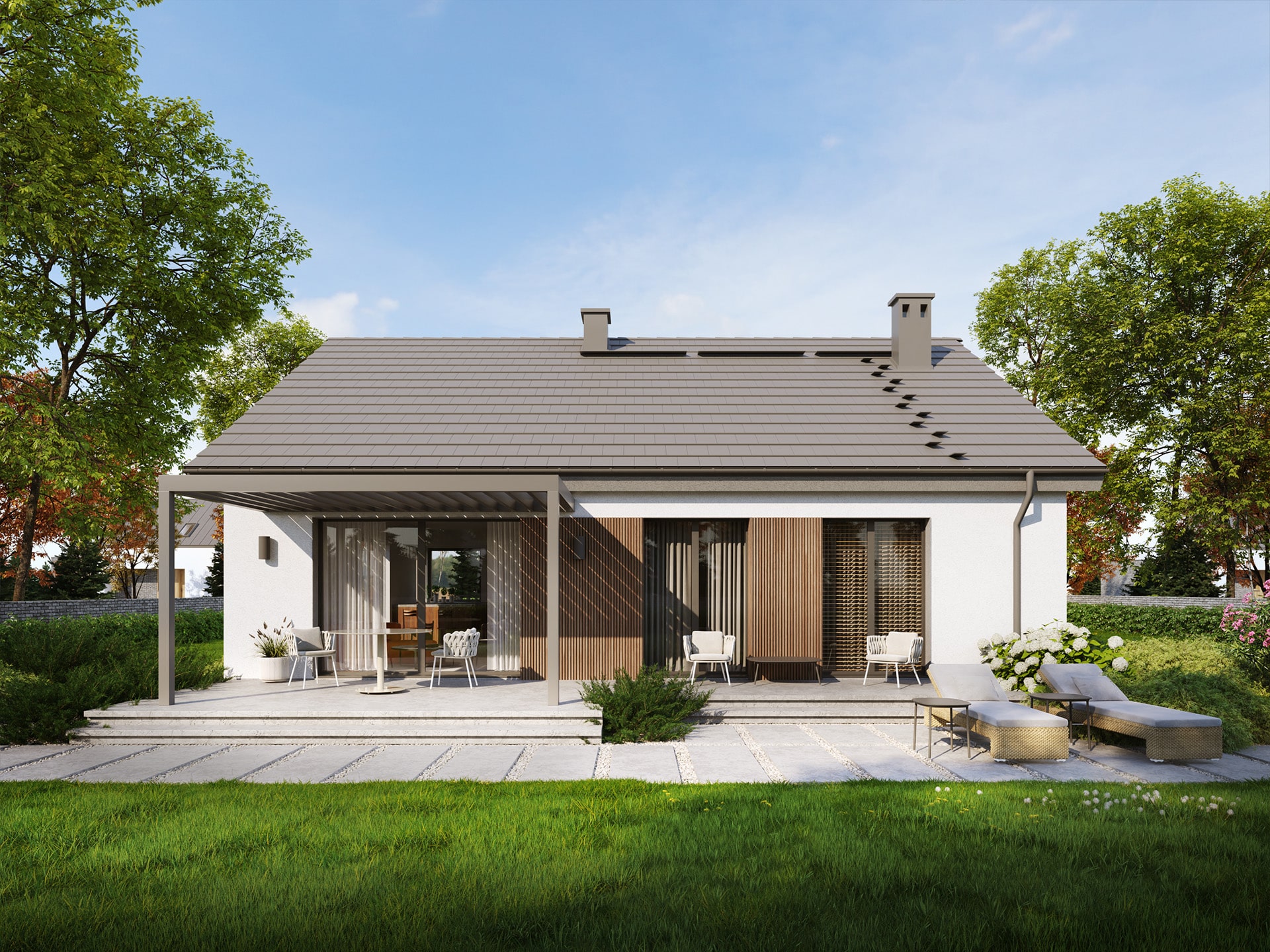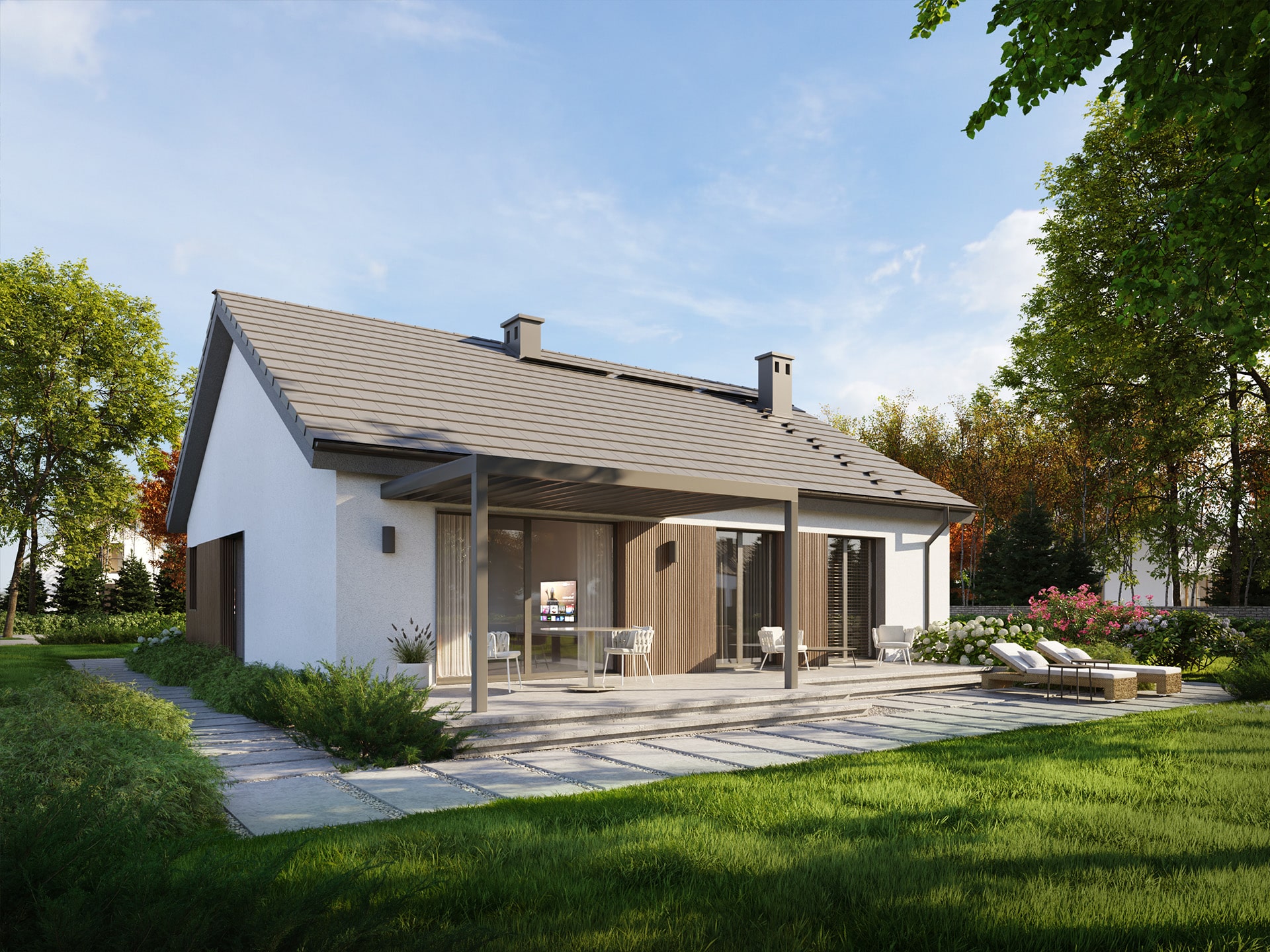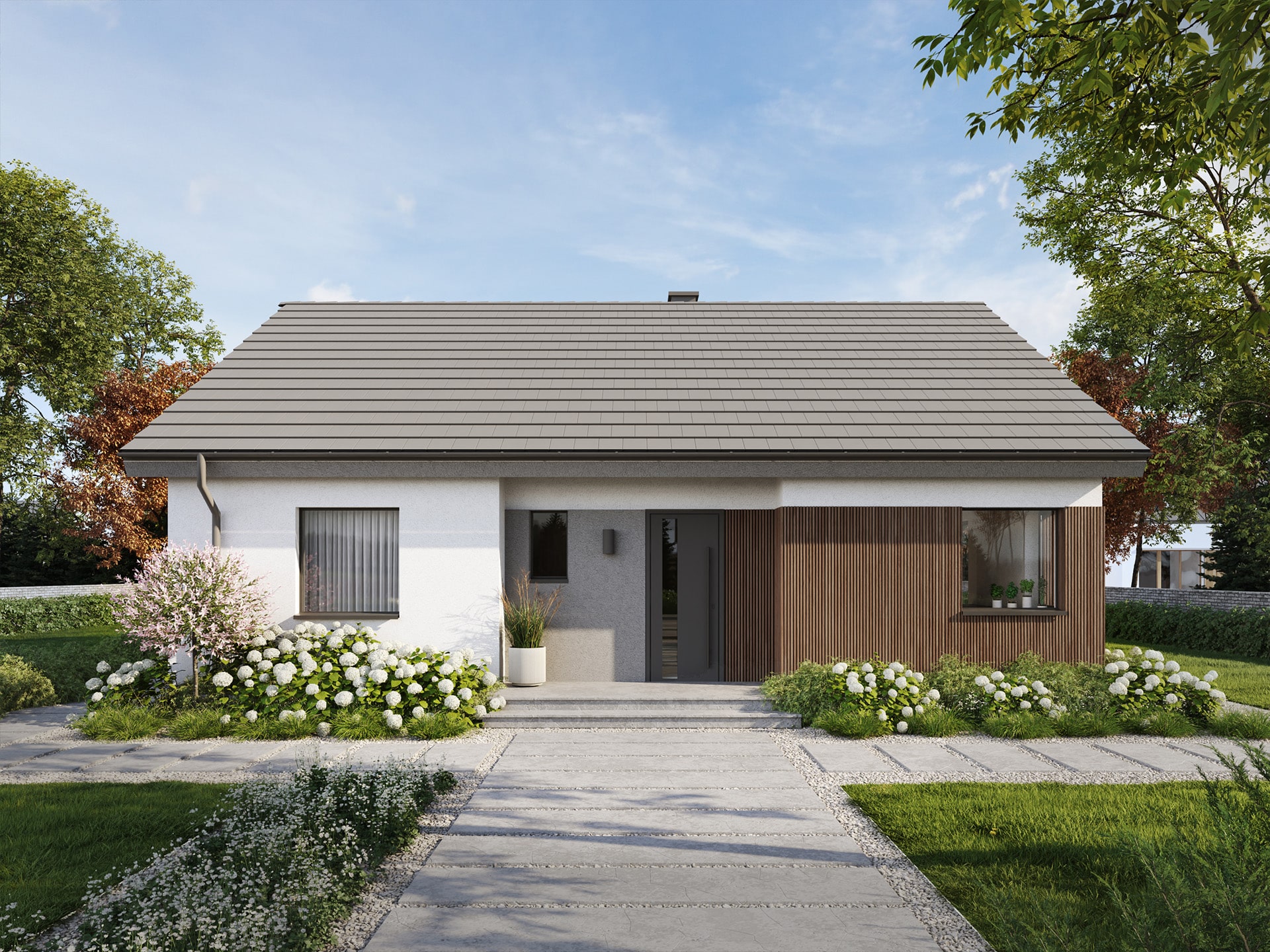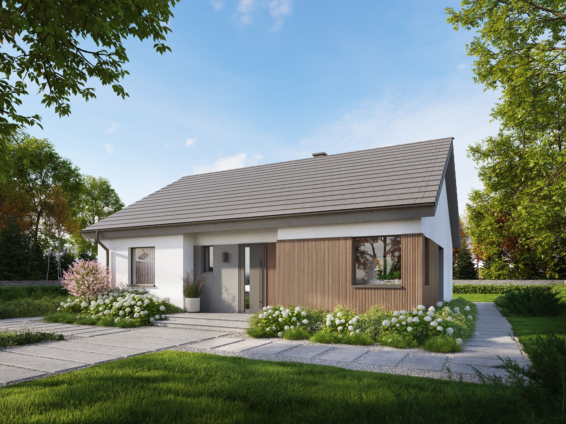 Eco 53 to dom parterowy, doskonała propozycja dla inwestorów prywatnych jak i deweloperów.  Prosta i zwarta bryła zwieńczona dwuspadowym dachem zapewni inwestycji ekonomiczny charakter i krótki czas budowy. Taka konstrukcja pozwoli nie tylko zaoszczędzić na kosztach budowy i późniejszej eksploatacji, ale również doskonale wpisze się w każdy krajobraz. Ciemna dachówka doskonale komponuje się z jasnym tynkiem i drewnianą okładziną.
